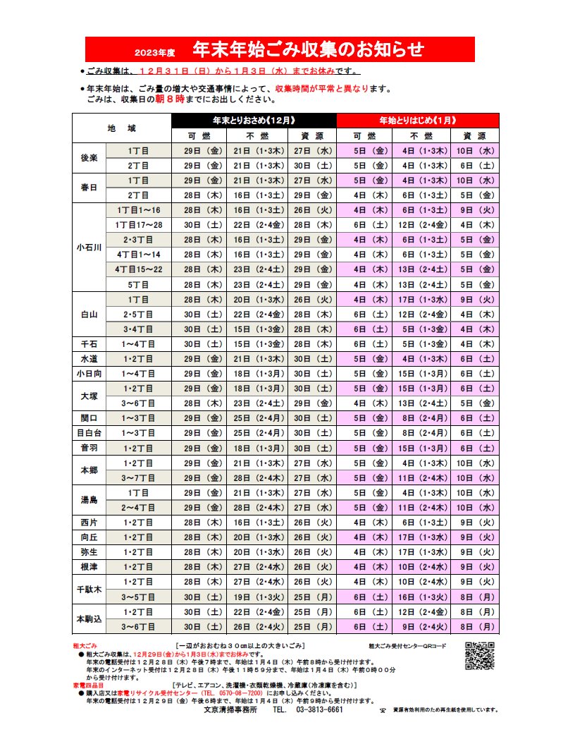 【お知らせ】ごみ収集は、12/31(日)から6年1/3(水)までお休みです。年末最後の収集後は、年始最初の収集日まで絶対にごみを出さないでください。詳しくは区HPをご覧ください。www.city.bunkyo.lg.jp/tetsuz..