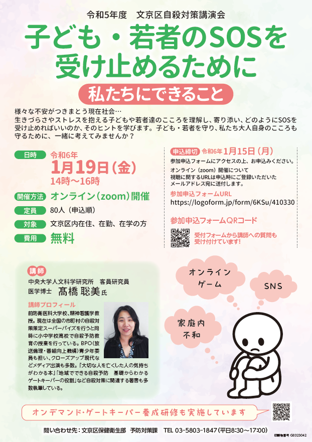 【募集】1/19(金)14時~16時に文京区自殺対策講演会「子ども・若者のSOSを受け止めるために~私たちにできること~」を開催します。参加希望の方は以下の申込フォームよりお申込み下さい。