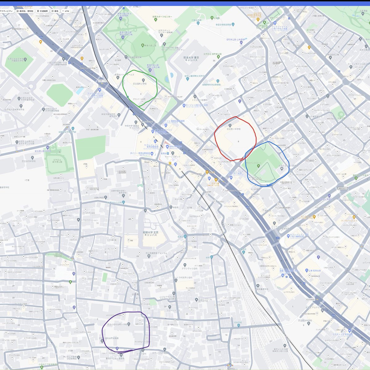 ① 竹早公園・図書館の敷地(水色)に小・中学校と図書館が入るでっけー複合施設を建設ッ‼️