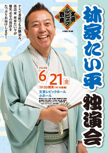 6/21(金)文京シビックホール、小ホールで開催される「文京シビック寄席 林家たい平独演会」のチケットが、明日3/10(日)10:00よりシビックチケット、チケットぴあで発売開始となります。ぜひ、お買い求めください!