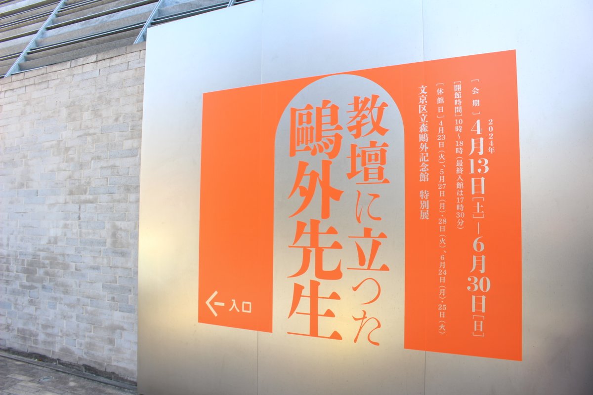 当館は現在、4月13日開幕の特別展「教壇に立った鴎外先生」に向けて展示替えを行っています。今回も、自動ドアと団子坂側外壁に展覧会タイトルのロゴシールを貼りました。
