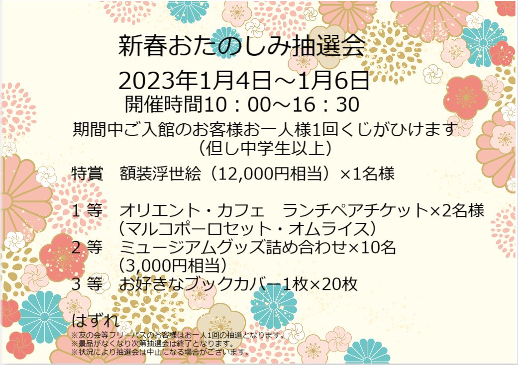 新春おたのしみ抽選会開催のおしらせ🎍令和5年1月4日(水)~1月6日(金)の期間中、入館された皆様にプレゼント企画として、ミュージアムグッズなどが当たるお楽しみ抽選会を開催いたします!ぜひご来館下さい..