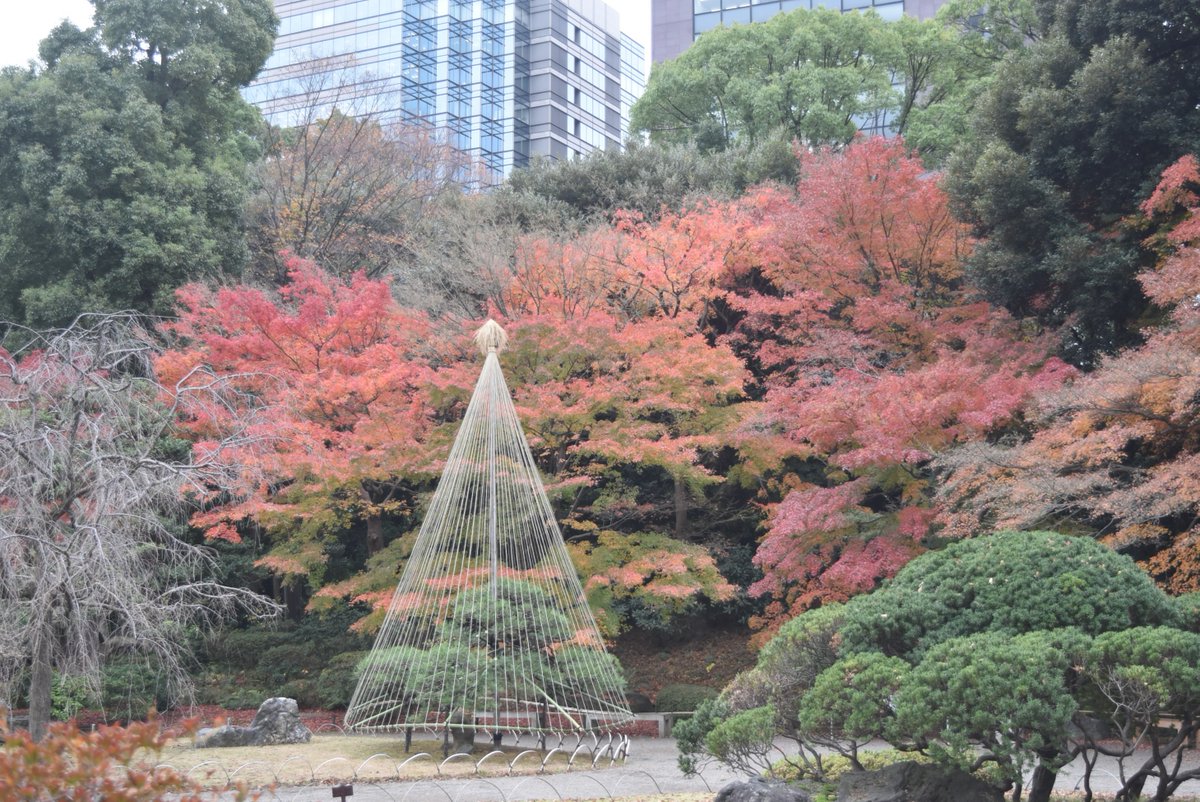 紅葉は終盤に至り赤味が深さを増し、松は冬に備え雪吊りのスタイルを見せています。Lerougissementdefeuillesdevientencoreplusfoncé.L’accessoiretr..