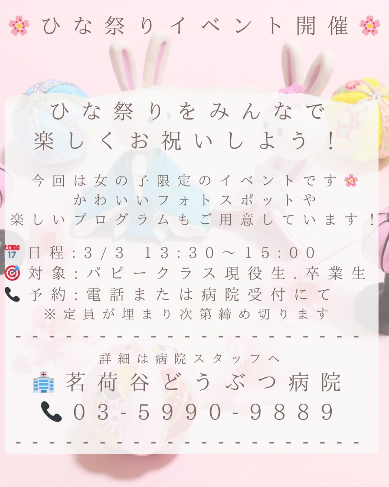 .🌸ひな祭りイベント開催のお知らせ🌸3/3(月)に女の子限定の「ひな祭りイベント」を開催します🎎💕かわいいフ..