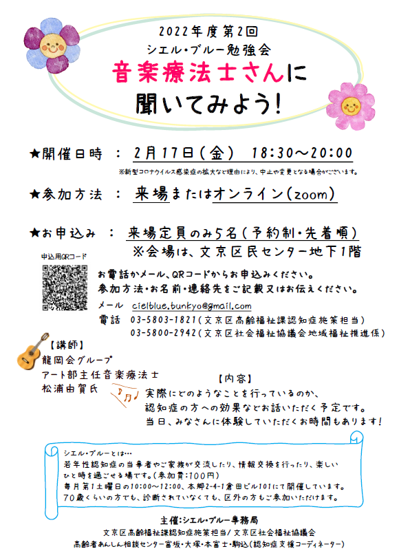 【イベント】2/17(金)18時30分から区民センターで『若年性認知症の会シエルブルー勉強会 音楽療法士さんにきいてみよう』を開催します。参加方法は来場またはオンライン(zoom)からお選びいただけます。事前申し込み制です。