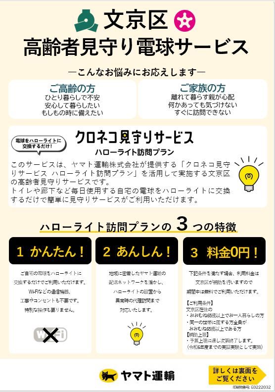 【お知らせ】区では、ひとり暮らし等の高齢者や家族の安心した生活のため、通信機能が付いた電球を活用した新たな見守り事業である「高齢者見守り電球サービス」を実施しています。ひとり暮らしで不安な方や離れて暮..