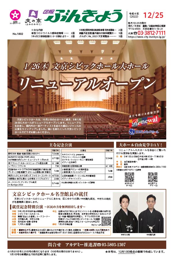 【お知らせ】区報ぶんきょう12月25日号を発行しました。町会・自治会などを通して全世帯へ配付しています。図書館・地域活動センターなど区の施設、区内地下鉄全駅にも配架しています。ぜひご覧ください。