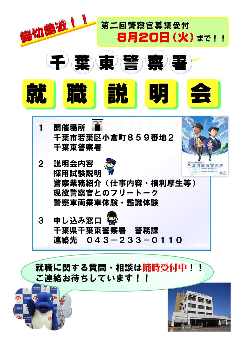 【#千葉東警察署からのお知らせ】千葉東警察署では、令和6年度第2回警察官採用試験に向けた採用相談を随時受け付けています。警察の仕事に興味のある方はお気軽にご連絡ください。第2回採用試験の受験申込み期限..
