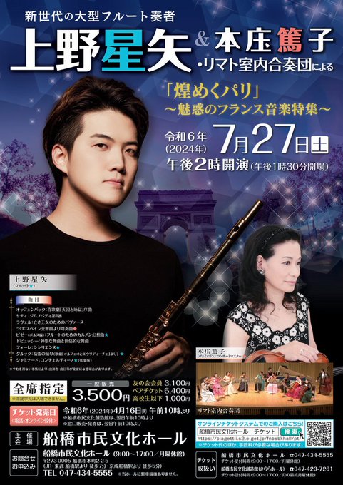 \公演まであと15日/市民文化ホールでフランスの気分を味わいませんか?世界がパリ五輪で盛り上がっている中、船橋市ではパリ五輪に因んで、フランスの名曲をお届けします!チケットは好評発売中です。皆様のご来..