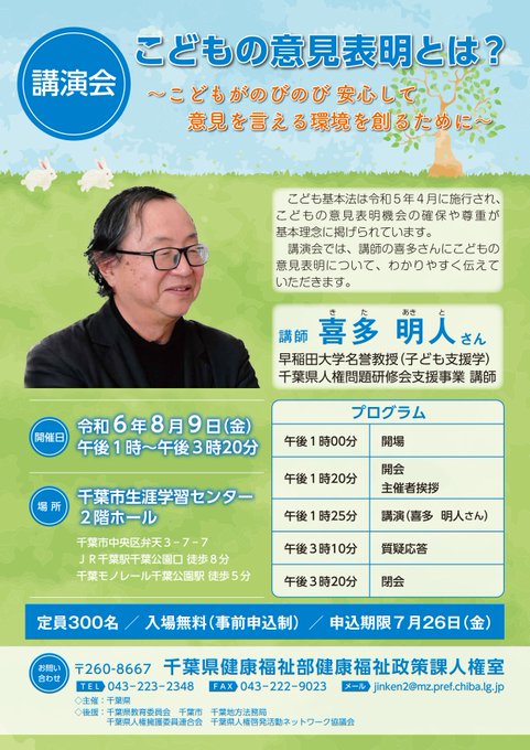 【8/9(金)講演会「こどもの意見表明とは?」】こどもがのびのび安心して意見を言える環境を創るために、「こどもの意見表明」をテーマとした講演会を開催します。講師:喜多明人氏(早稲田大学名誉教授)会場:..