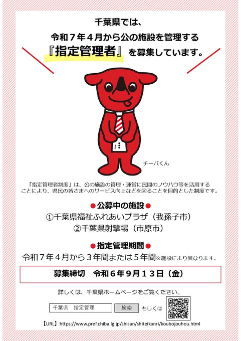 【指定管理者(候補者)募集中】千葉県の公の施設では、民間ノウハウの活用や住民サービスの向上等を目的として、指定管理者制度を導入しています。今年度末に指定管理期間が満了する2施設において、令和7年4月か..