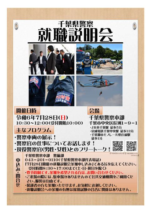 【#警備部主催#就職説明会情報】7月28日(日)#千葉県警察本部で就職説明会を開催!県警本部で働く警察官とのフリートークで、疑問や心配ごとを解消しましょう!警察車両も展示しますご参加お待ちしています!..