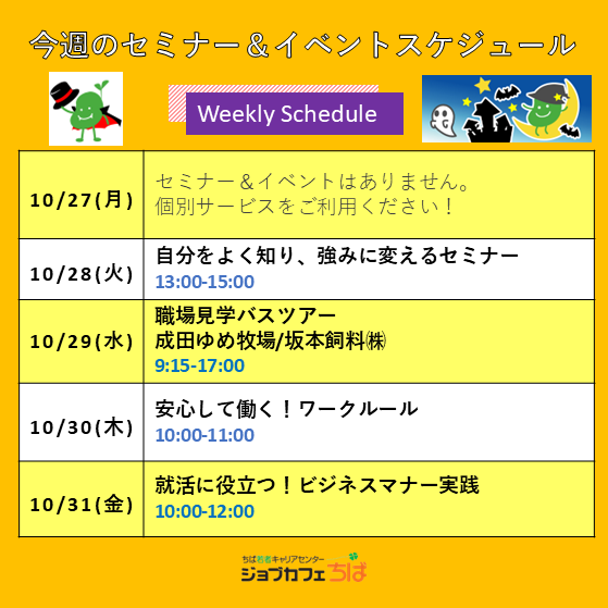 ジョブカフェちば来週の予定新しい環境で頑張ろう!と就職したものの万が一トラブルに巻き込まれたらどうしたらいい?ハラスメントや労働環境・雇用契約との違い…安心して働く!ワークルールは困った時の対応やどこ..