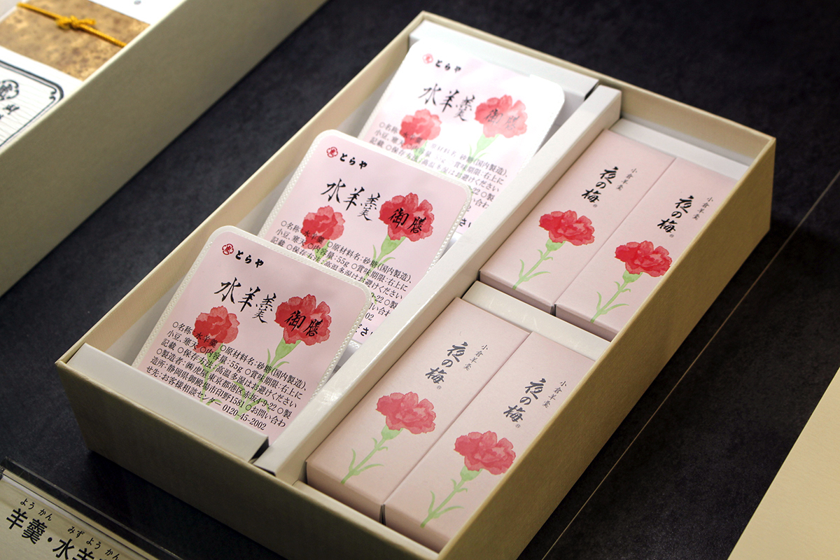 地階=食品売場にて、お母さんと一緒に美味しい時間を楽しめるグルメをご紹介。母の日パッケージの小形羊羹『夜の梅』と水羊羹『御膳(こし餡)』を詰め合わせた #とらや の母の日ギフトです。