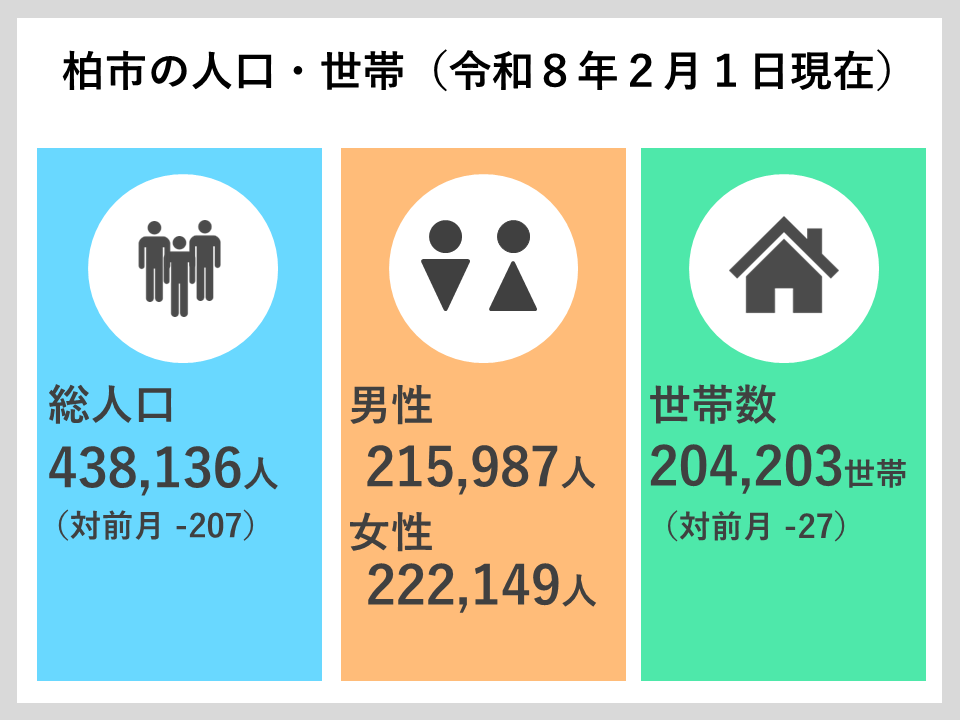 ■柏市常住人口■令和8年2月1日現在の柏市の人口は,前月比207人減の438,136人です。詳しくは市HPをご参照ください。→https://city.kashiwa.lg.jp/databunsek..