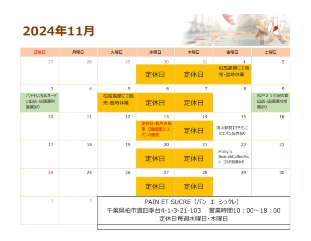 2024.11月の営業予定です😌11月1日(金曜日)と11月5日(火曜日)は柏高島屋での催事のため、店舗の営業はお休みです。ご不便おかけしますが、沢山パンを焼きますのでぜひ柏高島屋でお待ちしております..