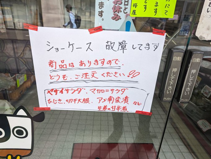 いやはや、参りました。揚げ物を陳列して、冷蔵ものは大型冷蔵庫から出しますので、どうぞご注文ください。