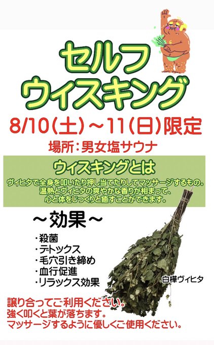 試験的に開催させていただきます!セルフウィスキングヴィヒタの劣化が速いようであれば予告なく終了させていただく場合がございます。予めご了承ください。#南増尾#柏#健美の湯