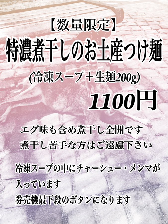 6/19水曜日 本日通常営業です。 限定ご飯は2つ ホルモン丼(30食ほど)とタレ焼き大判チャーシュー丼(20食)あります。 今日から特濃煮干しつけ麺のお土産販売します。20食のご用意です。 本日も宜しくお願いします。
