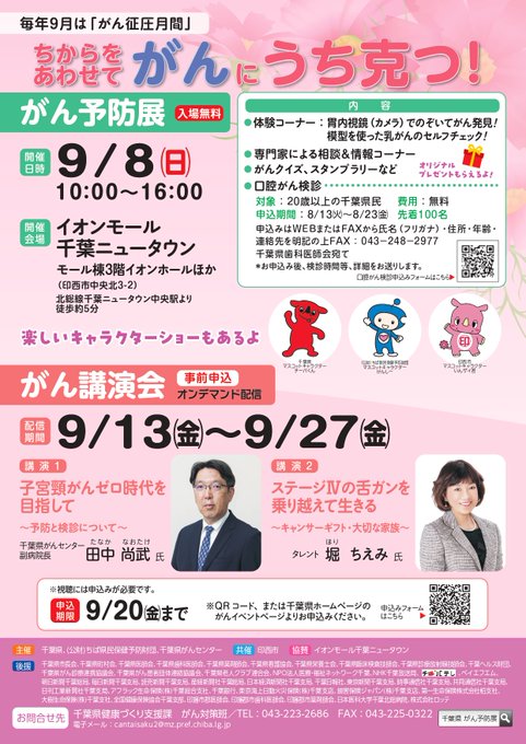 【9月は#がん征圧月間です】「がん」の予防や検診などについて知識を深めませんか。●がん予防展9月8日(日)会場:イオンモール千葉ニュータウン●がん講演会9月13日(金)から9月27日(金)方法:オンデ..