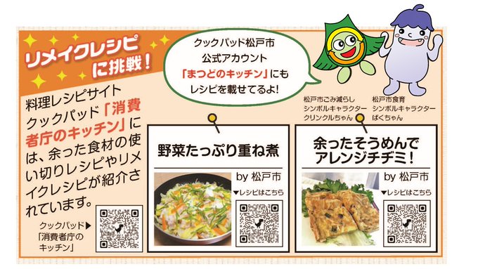 【食品ロス削減4】食品ロスを減らすことは、環境にやさしく、家計の見直しにも繋がります手軽にできることから取り組んでみませんか?クックパッド松戸市公式アカウントでも余りもののリメイクレシピを紹介している..