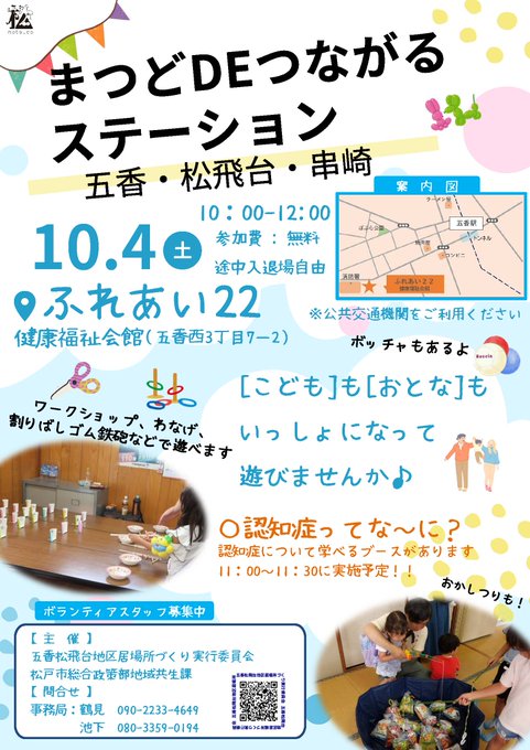 五香松飛台地区#まつどDEつながるステーション、今年度4回目は#ふれあい22での開催です!盛りだくさんのプログラムはホームページをチェック!今回は認知症について学べる特別ブースもあります!はじめまして..