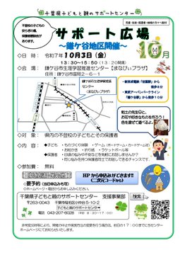 不登校のお子さん、保護者向け 【サポート広場 ~鎌ケ谷地区開催~】 お子さんたちの安らぎの場、保護者の懇談の場をご提供します。 保護者:懇談会 子ども:ボードゲーム、ものづくり体験など 開催日:10/3(金) 会場:鎌ケ谷市生涯学習推進センター ※要事前申込 https://cms2.chiba-c.ed.jp/kosapo/0c061700289cde75b17116ba0fefea91…