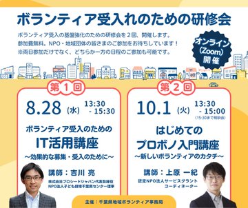 【ボランティア受入れのための研修会 参加団体募集!】 NPO・地域団体の皆さんに向けて、ボランティアを受け入れる際に必要な知識を学ぶ研修会を開催します。 参加費は無料。オンライン開催です。ご参加お待ちしています! 〇IT活用:8/28(水) 〇プロボノ:10/1(火) https://chiba-volunteer.jp/news/training2024…