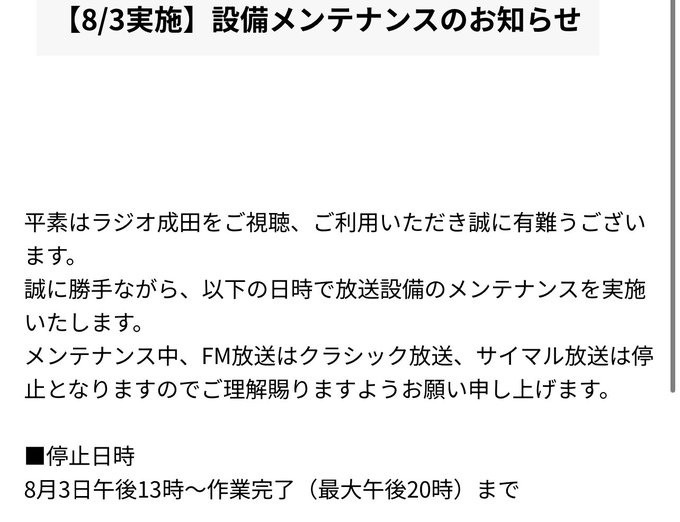 #ラジオ成田から#放送設備メンテナンスによる「放送休止」のお知らせ8/313時〜20時頃まで放送設備のメンテナンスのため、一時放送をお休み致します。緊急時は作業を中断して放送を行います。お聴きの皆様に..