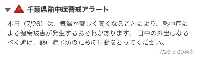 本日、熱中症警戒アラートが発令されています。水分補給を行い日中の外出を避け、クーリングシェルターの活用を検討してください。↓https://city.narita.chiba.jp/environme..