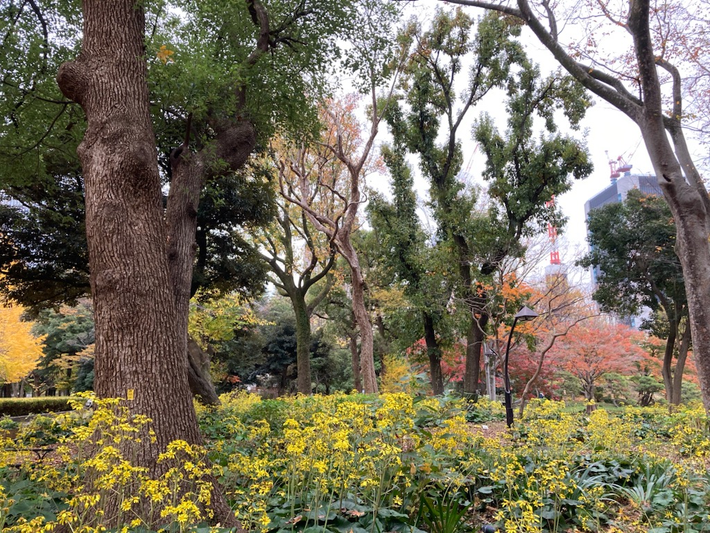 ツワブキの見ごろが続いています。光沢のある緑の葉と明るい黄色の花のコントラストが美しいです。園内あちこちでご覧いただけますが、霞門を入った雲形池周辺で、群生しているのをご覧いただくことができます。