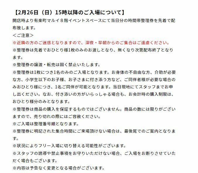 明日2/26(日)開店時より8階イベントスペースにて15:00以降ご入場の整理券を先着で配布致します。