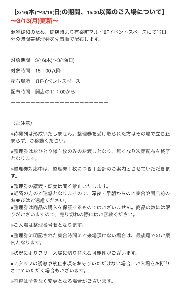 事前予約入場の4日間は、開店時より8Fイベントスペースにて15:00以降の入場整理券を配布いたします。