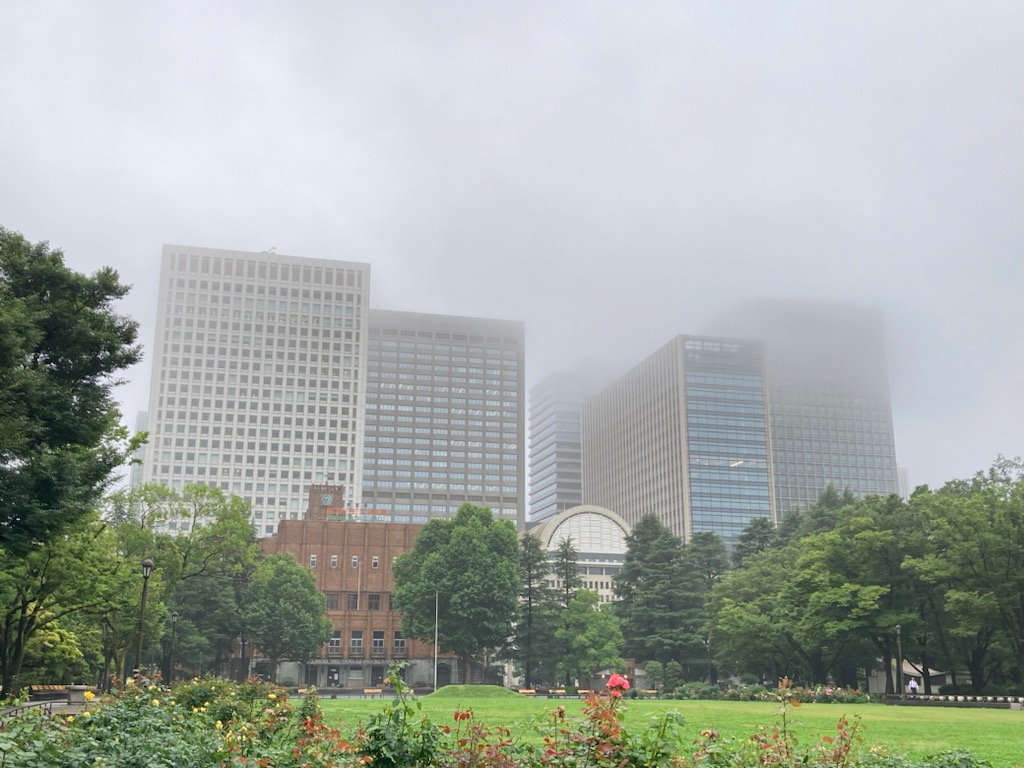 今日の天気予報は 雨のち晴。最高気温は28度で、夏日になるようです。日比谷公園上空には、霧が広がっています。現在、千代田区に、雷・濃霧注意報が発令中。湿度が高く、蒸し暑い日なるようです。熱中症に注意してお過ごしください。
