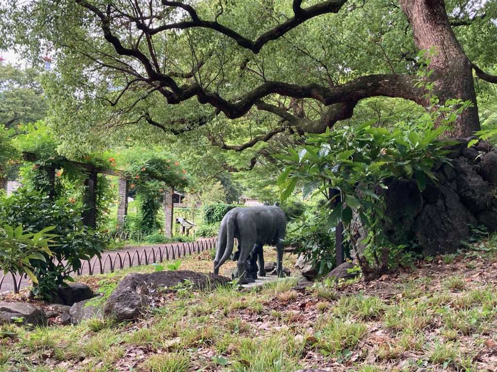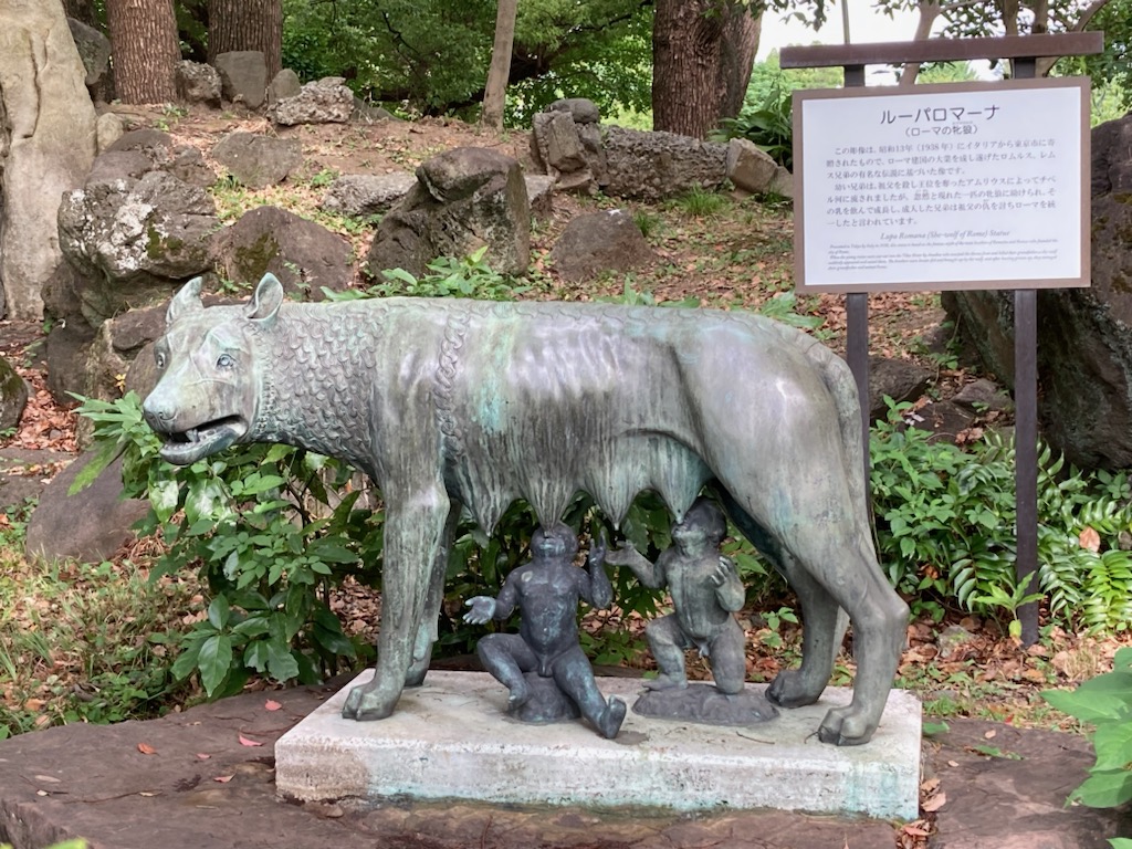 『永遠の都ローマ展』ポスターの像「ルーパ・ロマーナ(ローマの牝狼)像」は、園内でご覧いただけます。昭和13年にイタリアから贈られたもの。チベル河に流された幼い兄弟が、忽然と現れた一匹の牝狼に乳を与えられ成長し、ローマを統一したという伝説がモチーフだそうです。