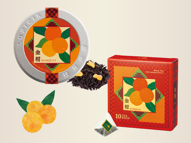 ほんのり甘く、ほろ苦い金柑の香りをつけた紅茶に、国産の金柑果皮をブレンド。すっきりとした風味が口いっぱいに広がります。