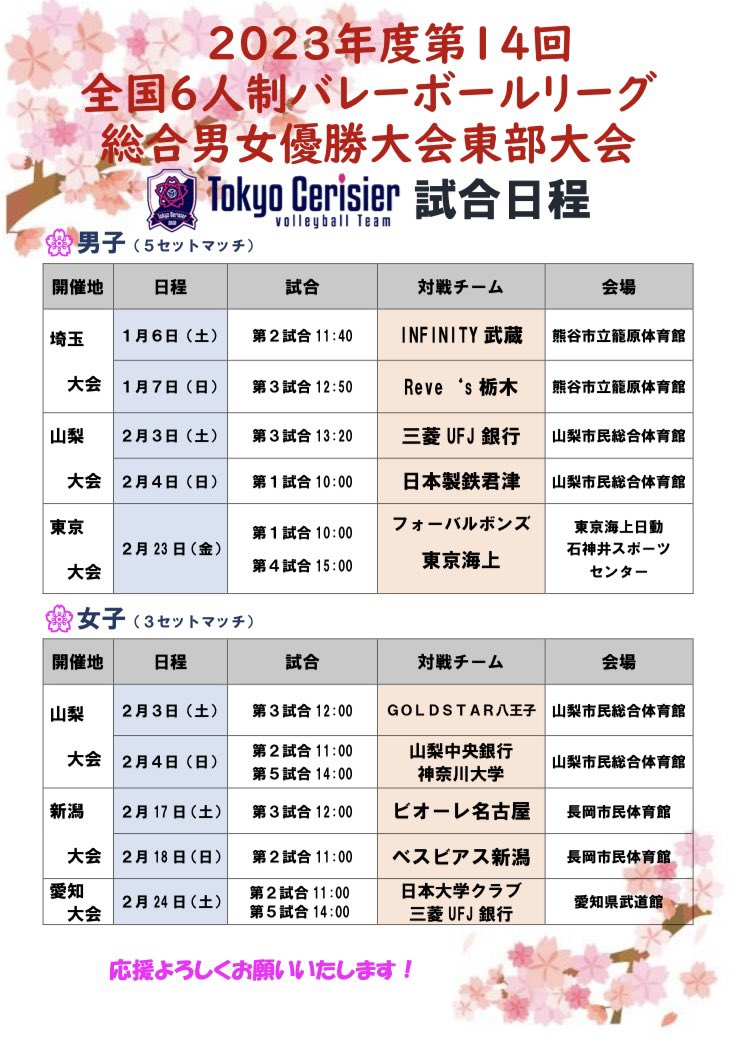お詫び🌸2023年度第14回全国6人制バレーボールリーグ総合男女優勝大会東部大会🌸女子スケジュールに未掲載のゲームがありました。大変申し訳ございませんでした🙇‍♂️引き続き、応援のほどよろしくお願いいたします📣‼️🏐