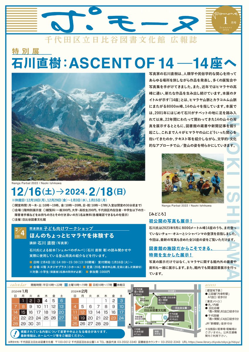 2024年最初の号は特別展「#石川直樹:ASCENT OF 14 ー14座へ」をカラーでご紹介しています。【図書フロアからのお知らせ】もカラーでお届けしていますので、是非ご覧ください。