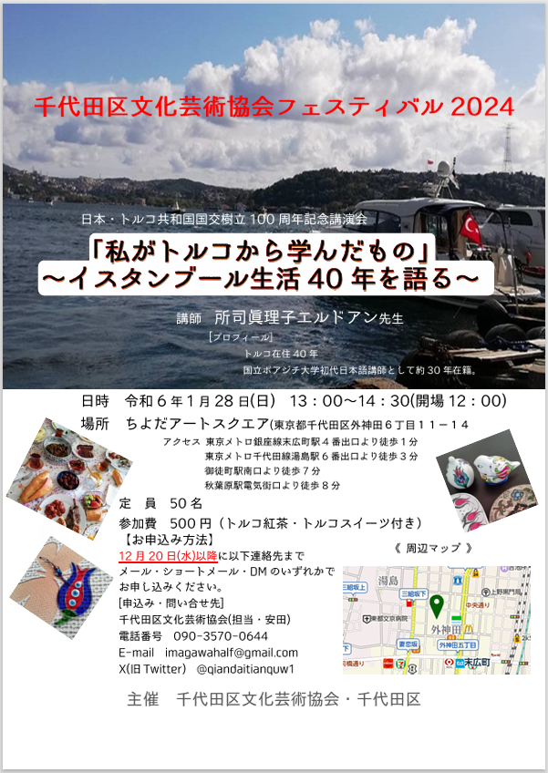 (続き)こちらのチラシを参照の上、お申込みください。 12:30からイントロダクションとして、「音楽で知るトルコ」演奏を行います。 講演後には美味しいトルコの紅茶とスイーツも味わえますよ。 #千代田区 #文芸協フェス #トルコ #トルコ講演会