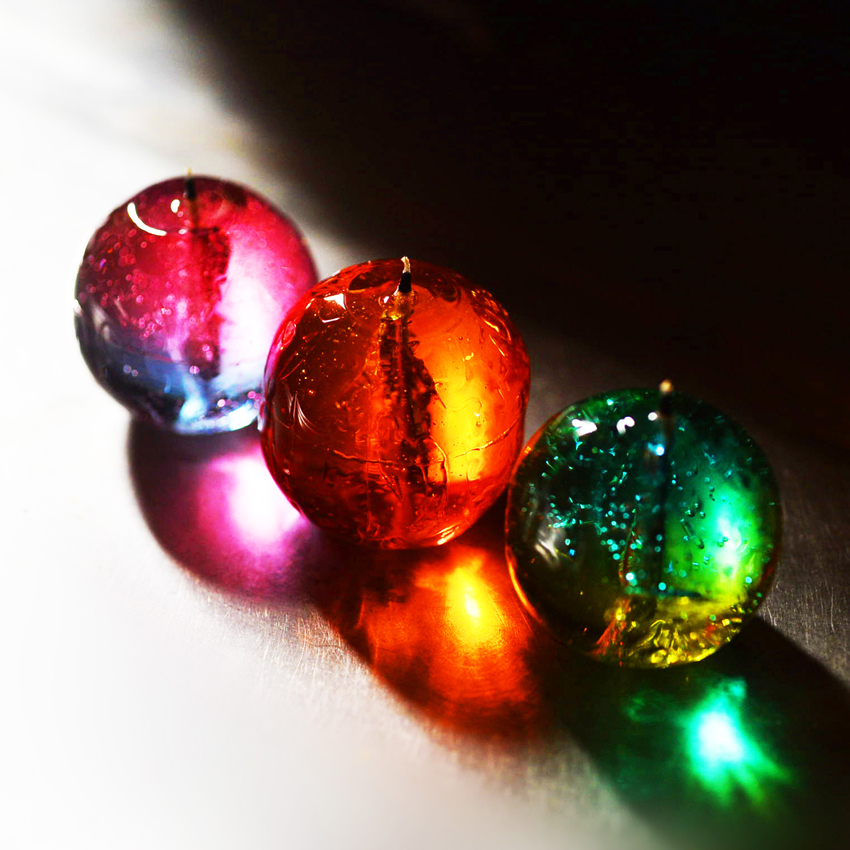 銀河のどこかにあるきれいな色の惑星を模した、キャンディ型キャンドル。スティックを外すと出てくる芯に火を灯せば、甘い香りと柔らかな光がふわっと広がります。香り別の5色展開。