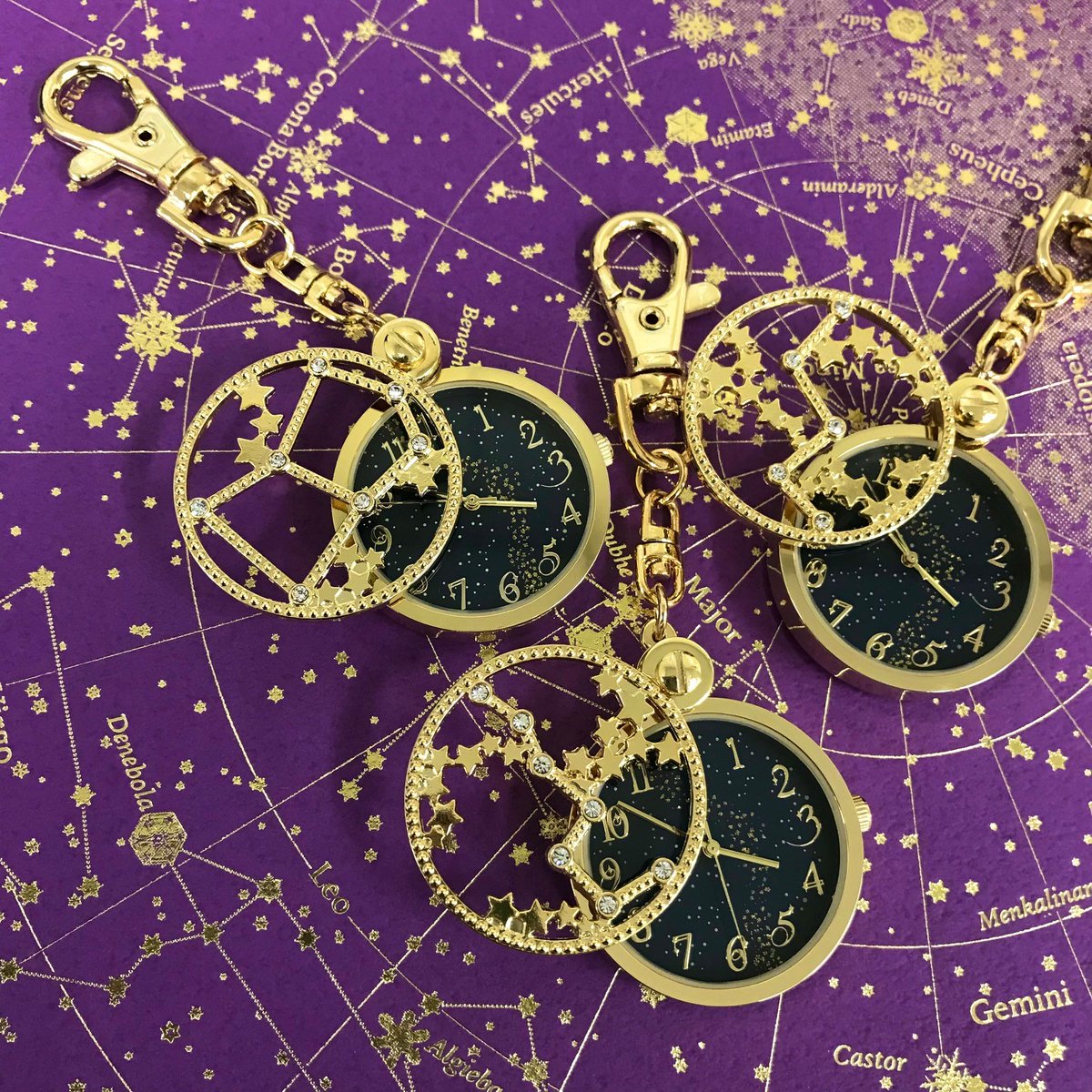 華やかな星空の文字盤に、星座を模ったスライドカバー付きキーホルダー型の時計