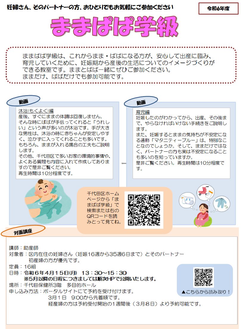 ままぱぱ学級は、これからまま・ぱぱになる方が安心して出産に臨み、育児していくために、妊娠期から産後の生活についてのイメージづくりができる教室です。申し込み受付中ですので、ぜひご参加ください。