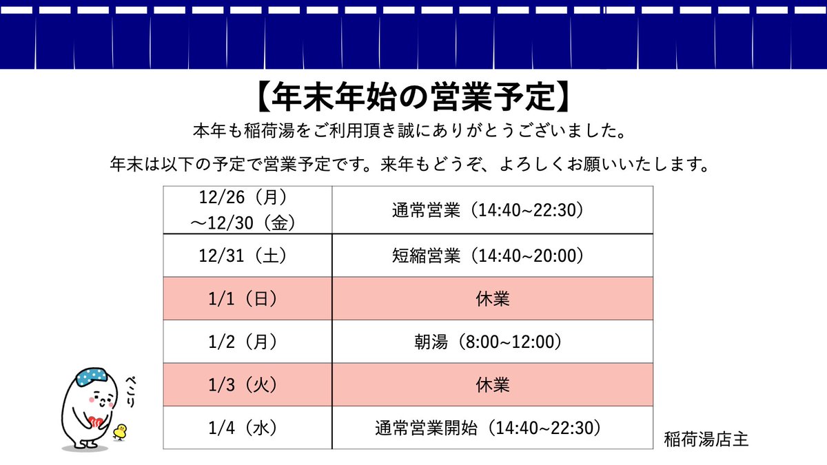 2022年内の営業予定です♨️ 12/31(土)は20時までの短縮営業とさせて頂きます。 なお、2023年は1月2日(月)午前8時から正午まで営業し、1月4日(水)より通常営業を予定しています。 よろしくお願いします。 #神田 #銭湯 #神田