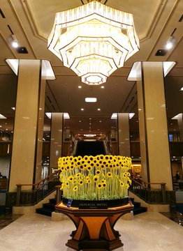 ロビー装花(帝国ホテル)人気の向日葵(ヒマワリ)の装花です。シャンデリアの光に照らされて輝いています。花材は、ヒマワリとレザーファンです。#ロビー装花#帝国ホテル#向日葵#ヒマワリ#ひまわり#第一園芸..