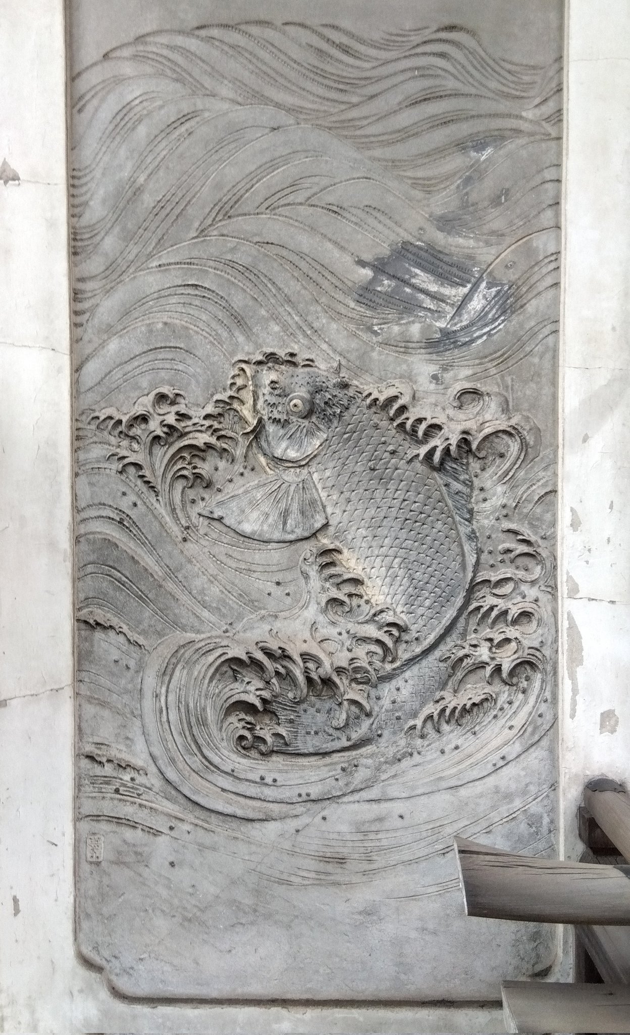 鏝絵(こてえ)と云えば入江長八。その孫弟子の池戸庄次郎の作と伝わる「鯉の滝のぼり」。昭和30年1955頃の作品らしい!柳森稲荷神社さんに残っている。