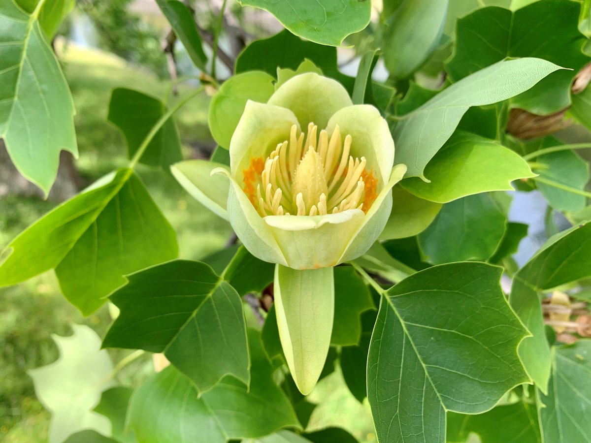 和名は学名「Liriodendron tulipifera」の前半(=ユリ)から、英語名の「tulip tree」と学名の後半(=チューリップ)は花の形がチューリップに似ていることから来たと。園内でも見られる「モクレン」と「ヒメタイサンボク」とは同じく「モクレン科」で親戚です。
