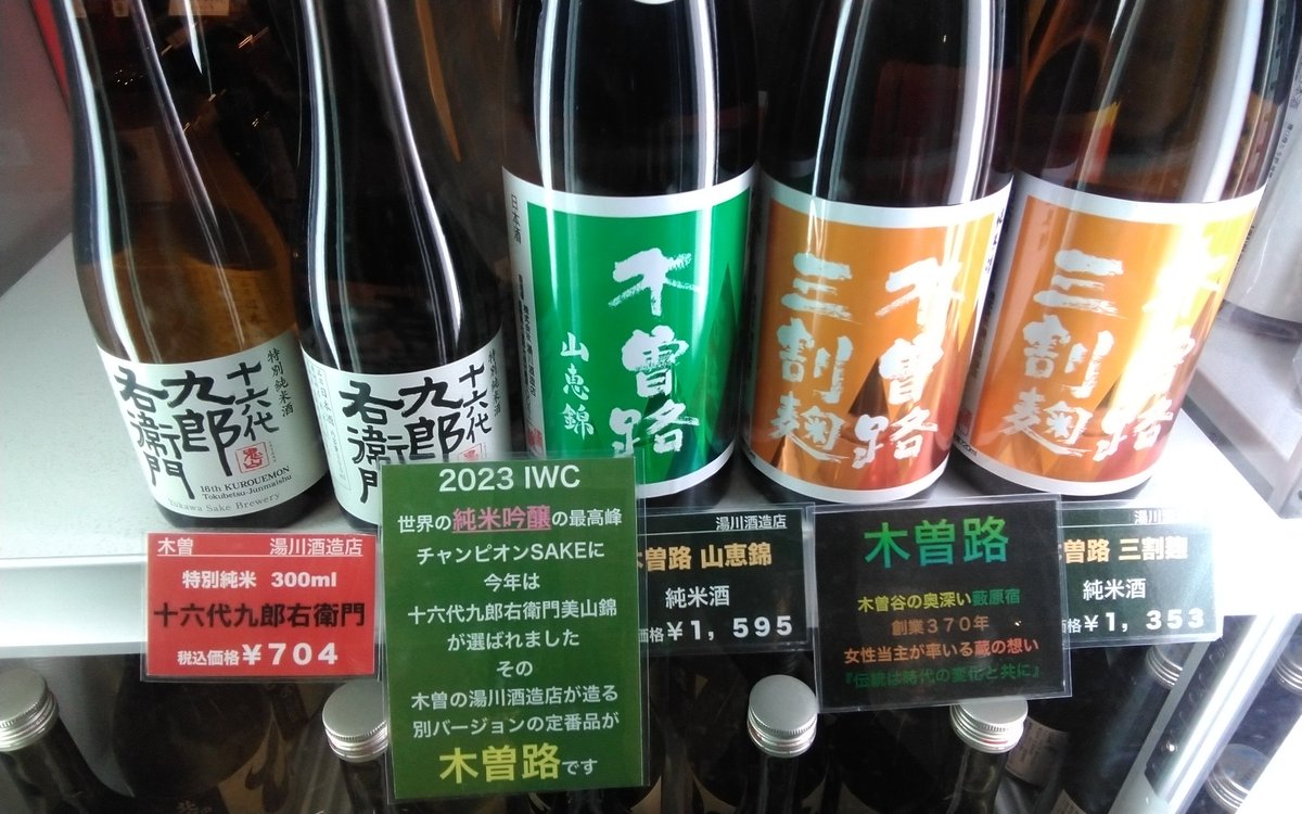 木曽の湯川酒造店様(2023IWCチャンピオンSAKE輝いた酒蔵さま)の十六代九郎右衛門の純米酒、木曽路山恵錦や、2023全国新酒鑑評会金賞受賞の大雪渓大吟醸、など数多く取り揃えております。