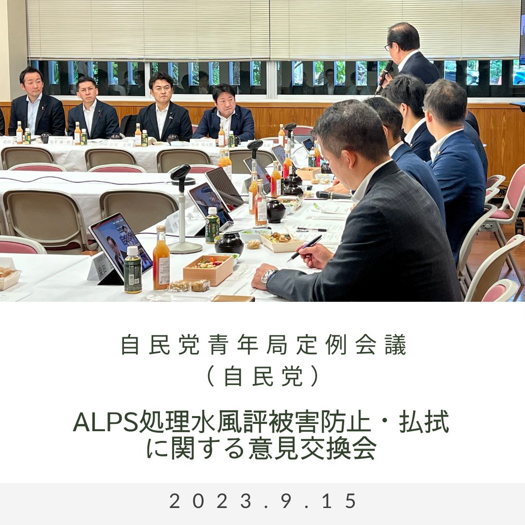 15日、ALPS処理水風評被害防止・払拭をテーマに意見交換会が党本部で開催され、東京からは福島県に縁がある芳賀竜朗 豊島区議、松平雄一郎 文京区議が出席。鈴木憲和 青年局長、金子恭之 組織運動本部長、渡辺博道 前復興相、額賀福志郎 東日本大震災復興加速化本部長、福島県連青年局役員等が参加。