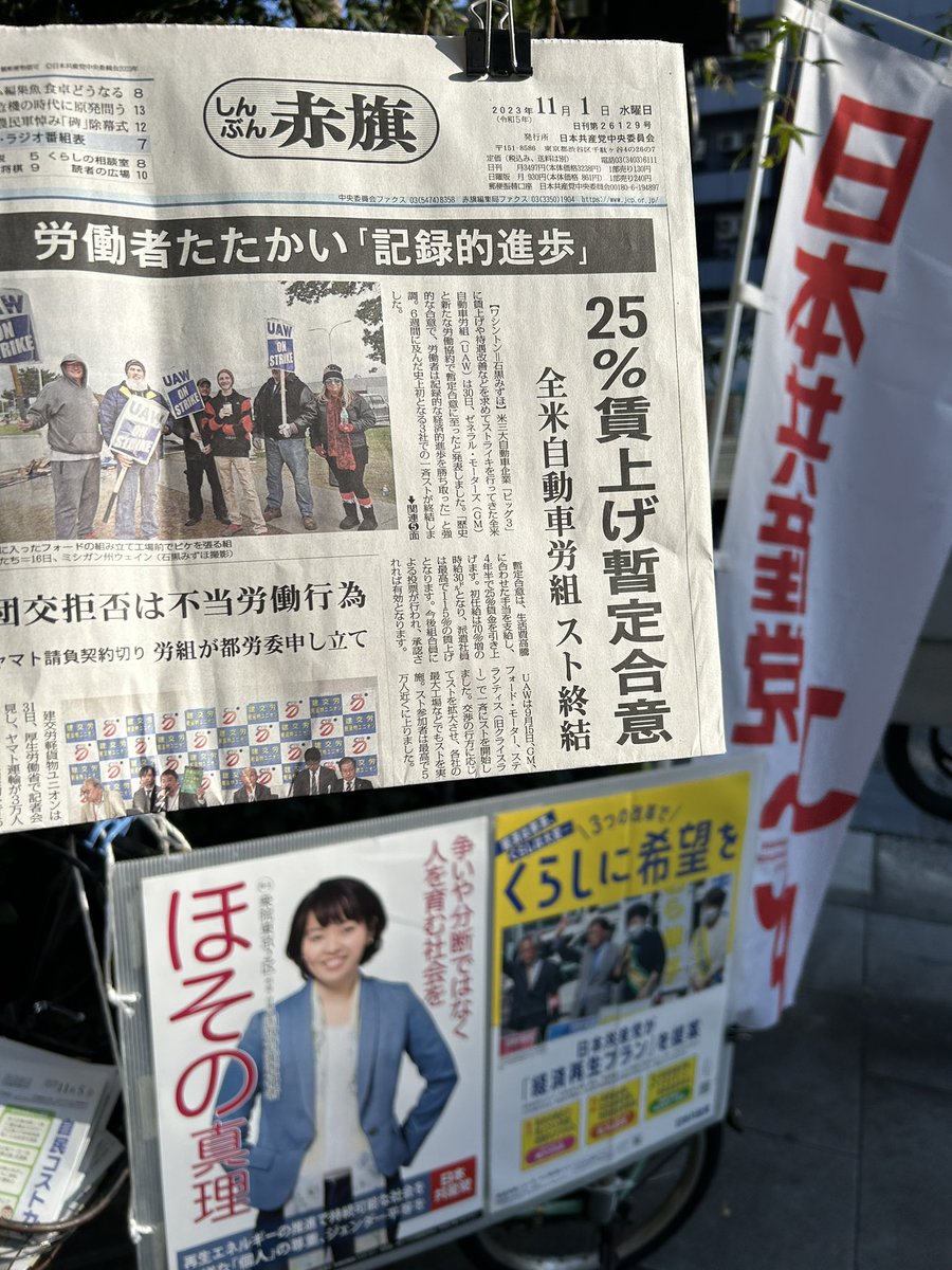 11月1日水曜日、#朝の宣伝。📰しんぶん赤旗の''全米自動車労組 25%賃上げ暫定合意“の記事を紹介しました
