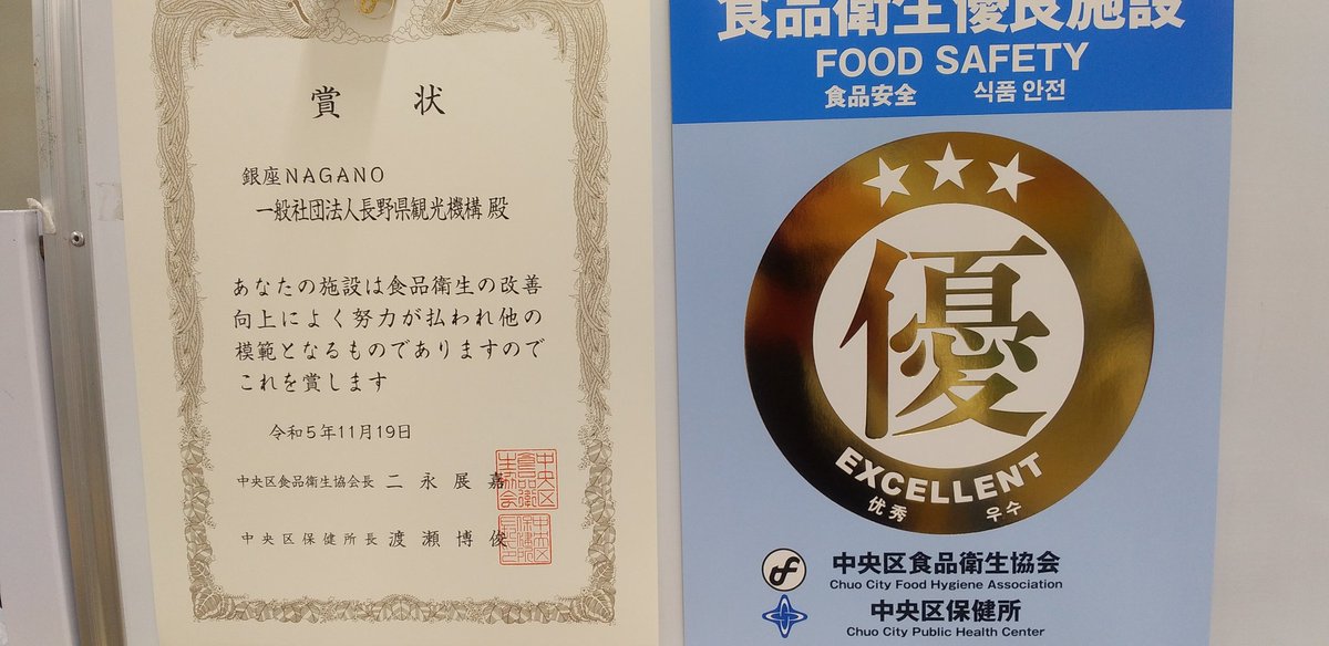 当店は、このたび、中央区食品衛生協会及び中央区保健所から、食品衛生優良施設として認定されましたので、ご報告致します。